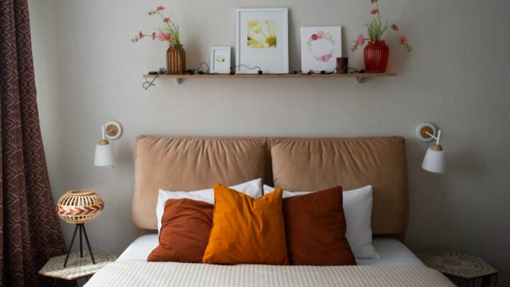 Se o chão está ocupado pela cama, olhe para cima. As paredes são áreas valiosas ao decorar o quarto de casal pequeno. Use prateleiras altas para guardar itens que você não usa todo dia e nichos para substituir a tradicional mesa de cabeceira. Ganchos atrás da porta ou painéis perfurados também ajudam a organizar bolsas, roupões e acessórios sem ocupar lugar dentro do armário ou sobre a cama.